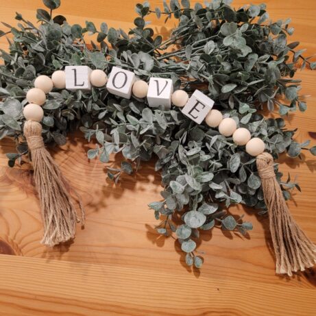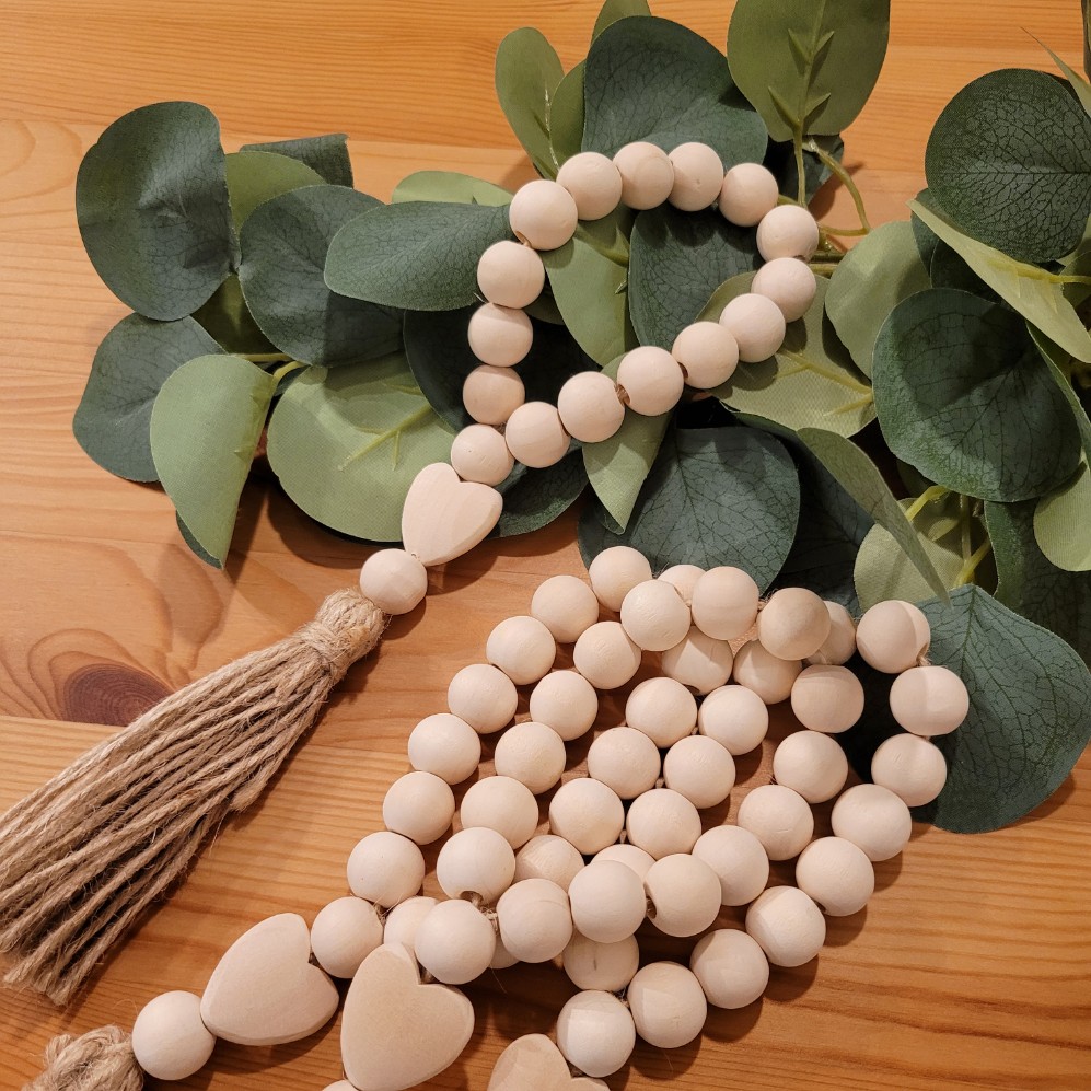 Celkové délka girlandičky včetně střapce je 27 cm, průměr korálku je 1,5 cm, velikost srdíčka 2,5 cm.
