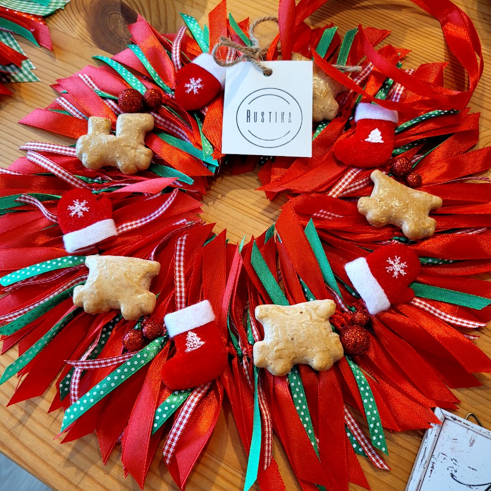 Ručně navázaný věnec o průměru 30 cm, se stuhou k zavěšení, s doma pečenými perníčky...