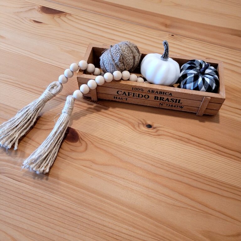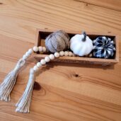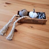 Sada obsahuje dřevěnou krabičku, korálkovou girlandu a 3 ks Farmhouse dýniček.