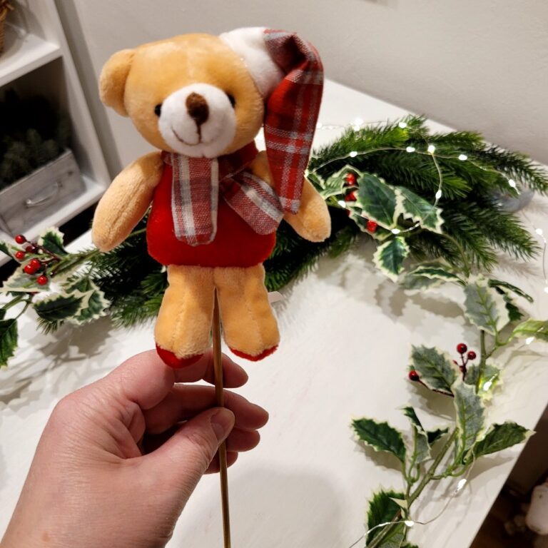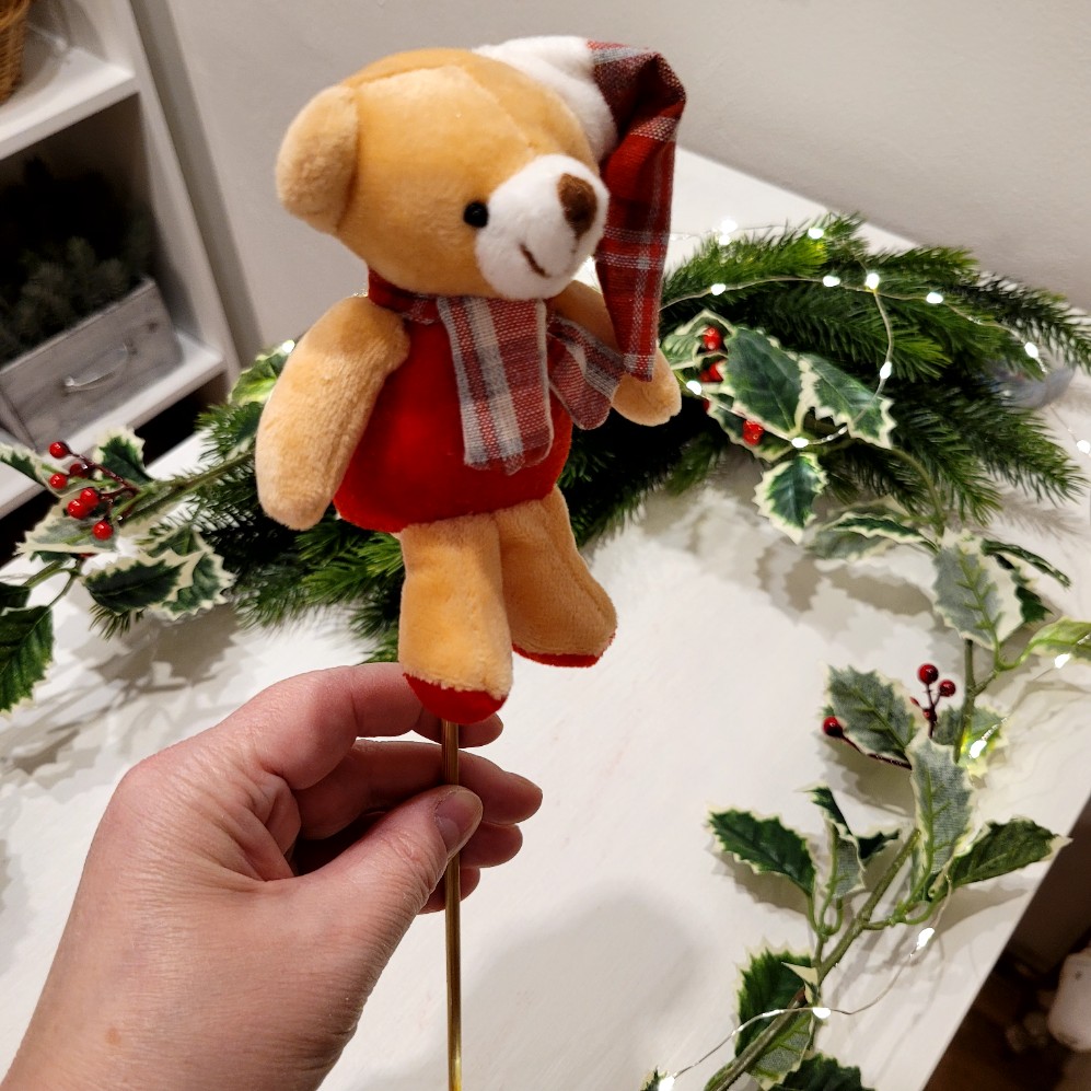 Velikost medvídka je 11 cm, délka zápichu je 30 cm.
