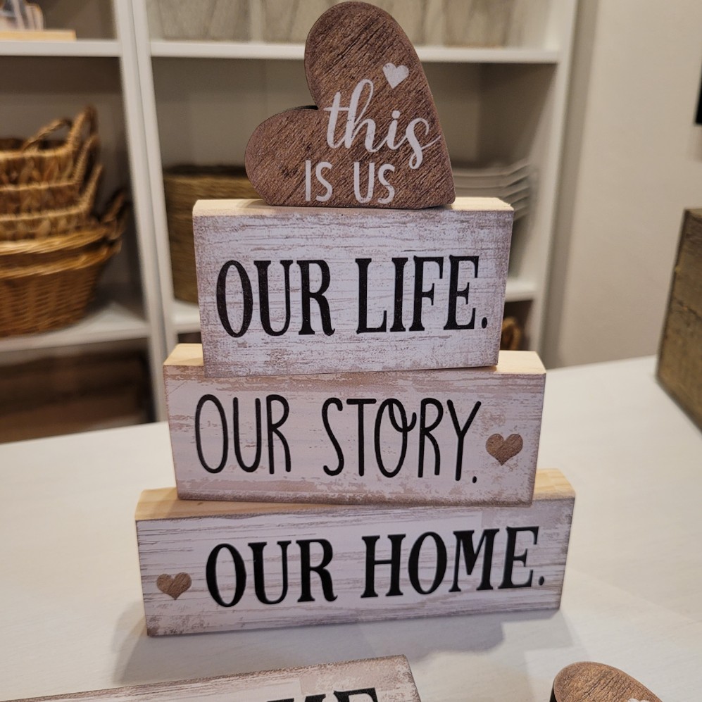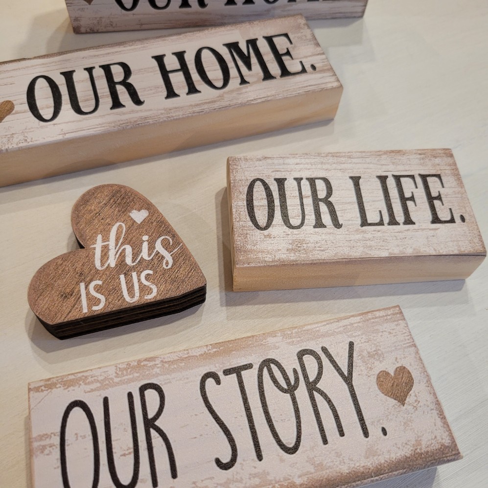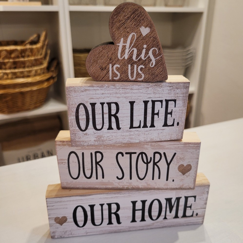 Rozměry: Our home 15*5*2 cm, our story 12*5*2 cm, our life 9*5*2 cm, this is us 6*5*1,5 cm.