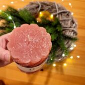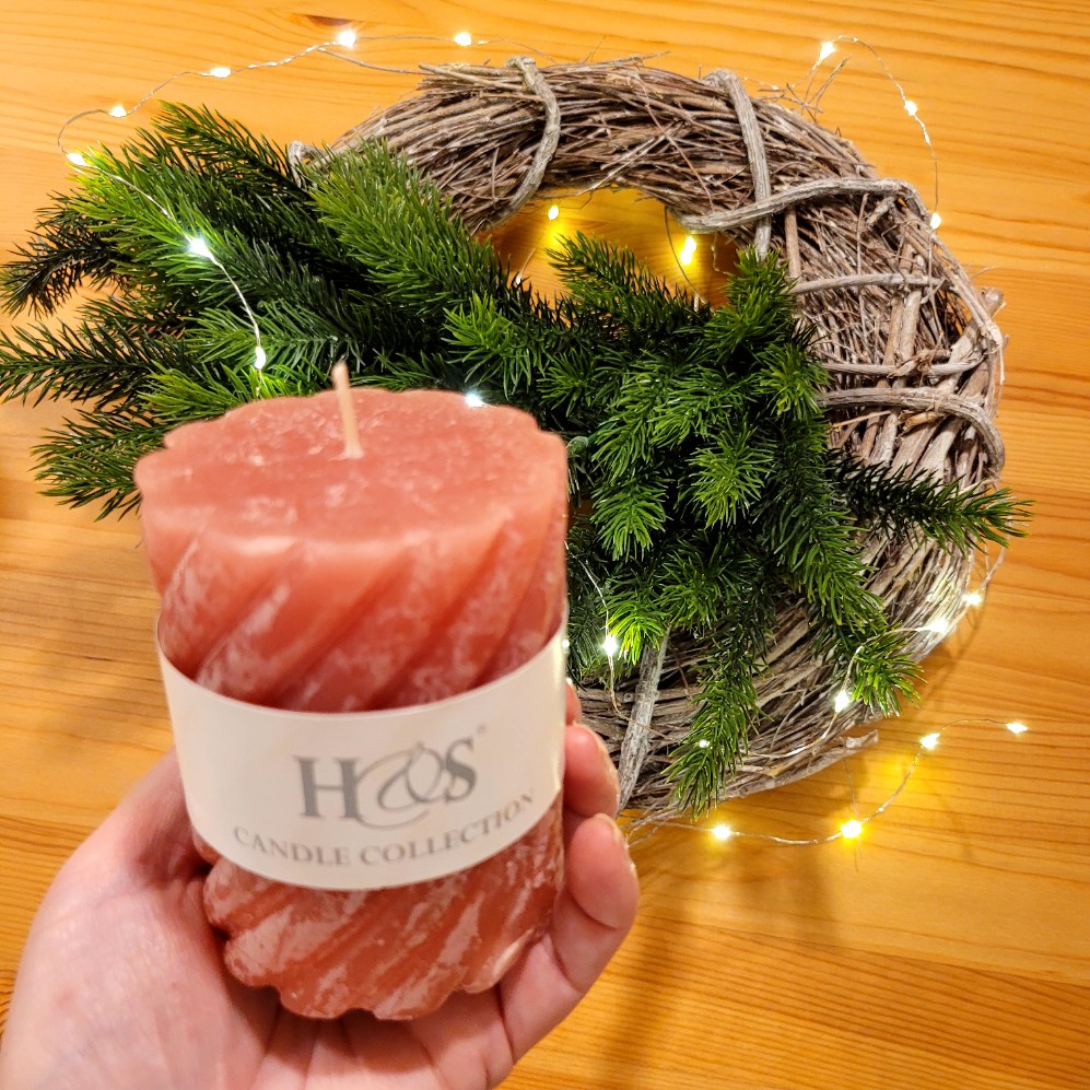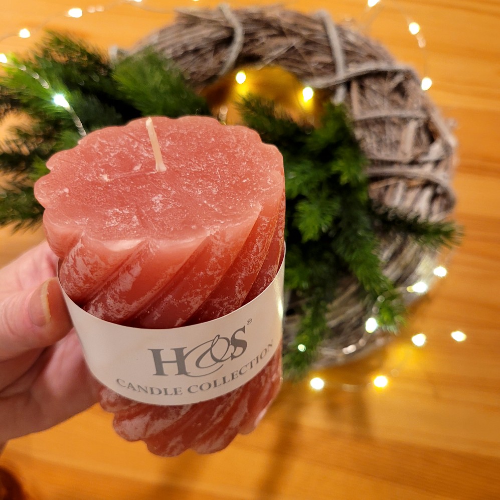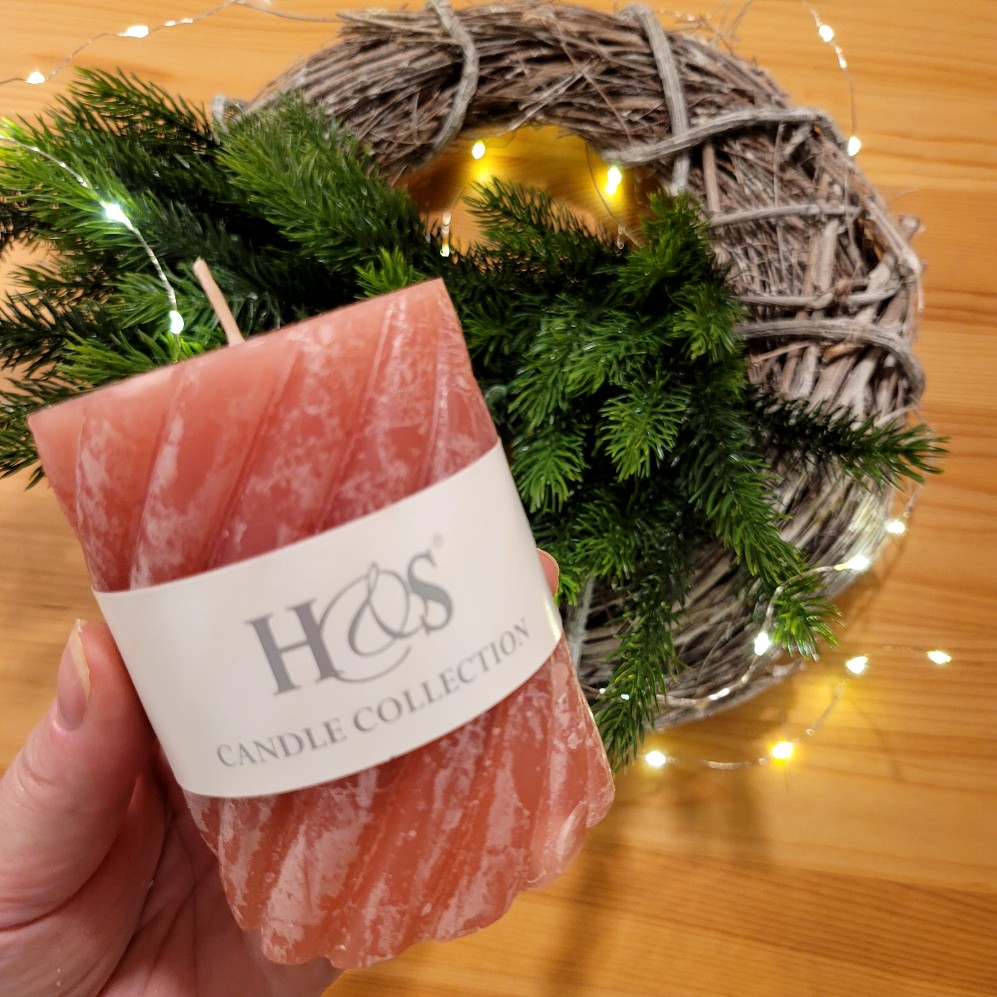 Rustikální svíčka s jemným reliéfním zdobením, ve velmi příjemné barvě růžovo-malinové.
