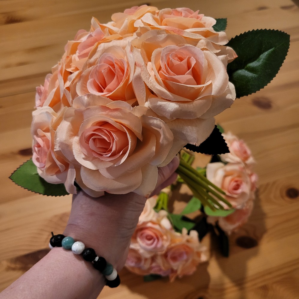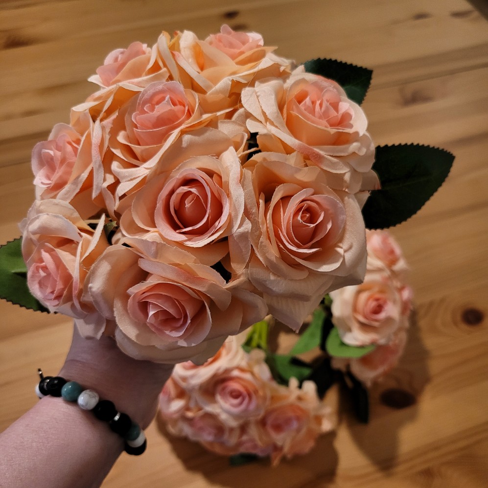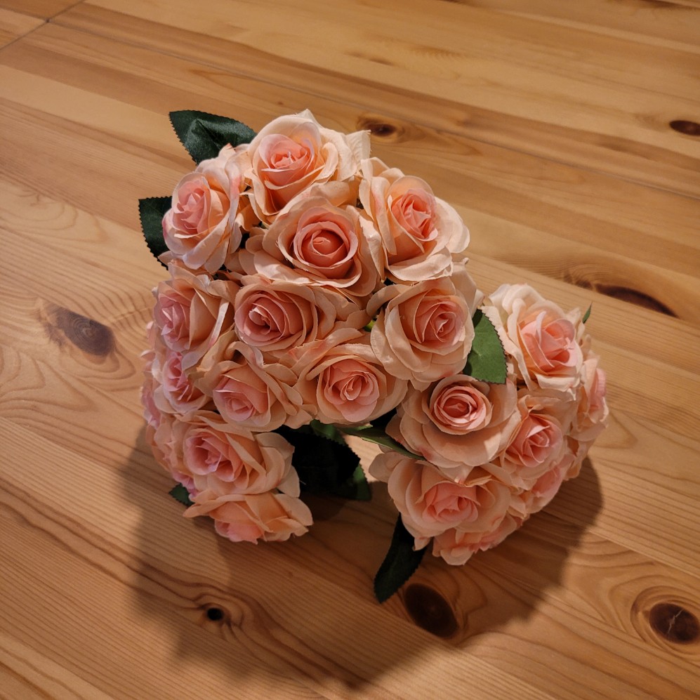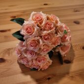 Růžiček v kytici je celkem 9, květní část má průměr 16 cm, délka celé kytice je 25 cm.