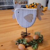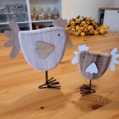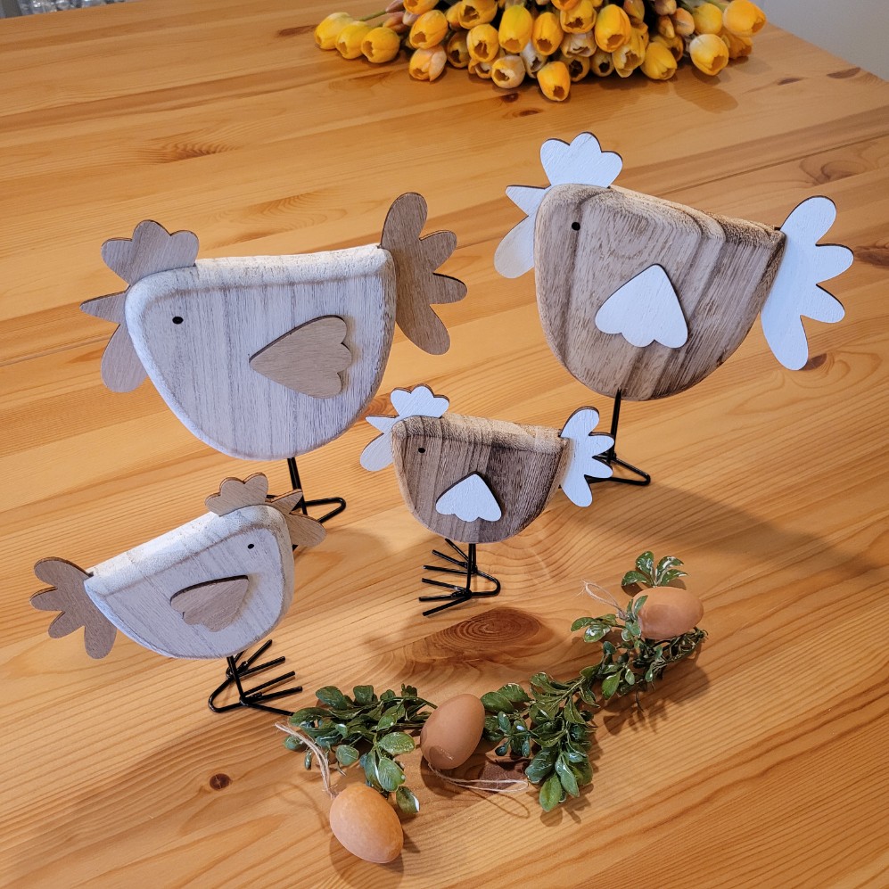 Velikost dřevěné slepičky je 18 cm na šířku a 22 cm na výšku.